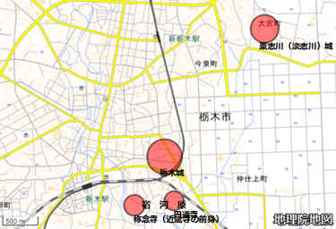 ② 天正12年(1584年)以降は、北条氏勢力の急伸長にともない栃木城を整備し、宿河原の町場を栃木(現在の栃木市中心街)に移して整備した。